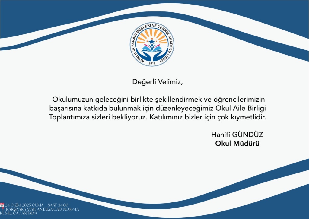 24.10.2025 Cuma günü saat 14:00'da yapılacak Okul-Aile Birliği toplantımıza tüm velilerimiz davetlidir.